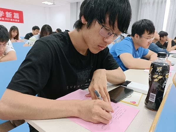 活动通过对过去高考的回忆,对现在问题的分析,引导同学们对未来目标进行思考。在轻柔的音乐声中,同学们开始了自己的考卷作答,忆高考初心,启大学新篇,他们将给一个月后大一结束的自己写一封信,通过与自己的对话,在反思、总结、期待中积蓄力量。同时,陈越与同学们约定,将为每一位同学的答卷写上辅导员寄语,勉励同学们“将来的你一定会感谢今天努力奋斗的自己”。