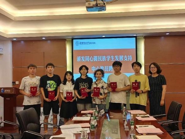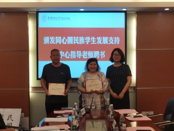 交流后,许静为新疆内派教师玛依拉、张明坤颁发同心圆民族学生发展支持中心指导老师聘书,为优秀民族学生代表颁发同心圆民族学生发展支持中心教员聘书。