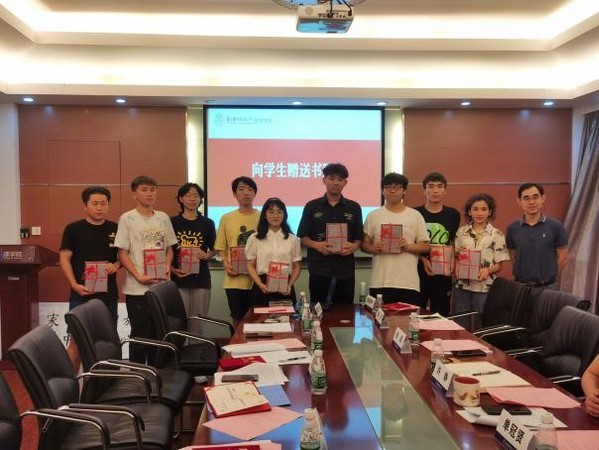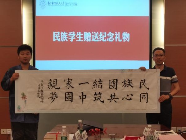 张跃向学生代表们赠送民族团结进步相关书籍。民族学生代表和文洋向单冠贤赠送书法作品,表达对学校为各民族同学的大学学习生活营造和谐奋进氛围的感激之情。