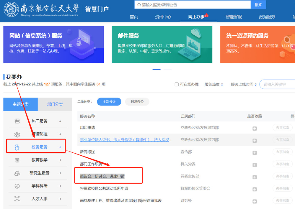 1. 登录学校智慧门户-网上办事大厅,网址://i.stxuejie.net/web/onlineService/,在“我要办”栏目版块选择“校务服务”,然后选择“报告会、研讨会、讲座申请”事项。