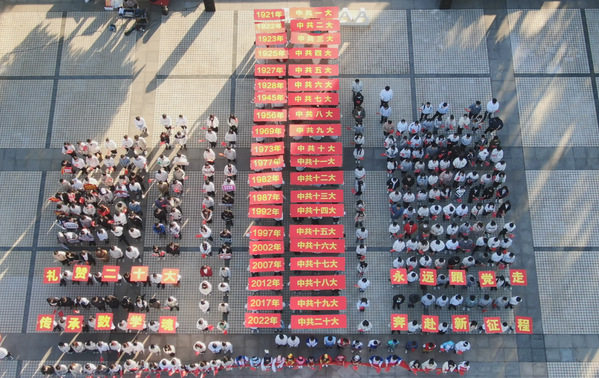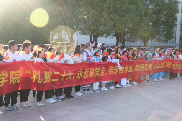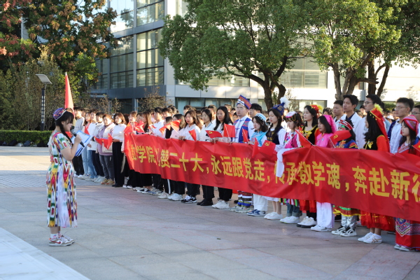 伴随着歌声,同学们的队列依次举起从1921年中共一大到2022年中共二十大的展示牌,仿佛二十大正一步步向我们走来,震撼人心,同学们更加深刻体会到了百年来党的坚定步伐,对党的二十大有了更深切的认识和理解,“礼赞二十大,永远跟党走”是同学们的共同心声,“传承数学魂,奔赴新征程”是数学学子的共同誓言。