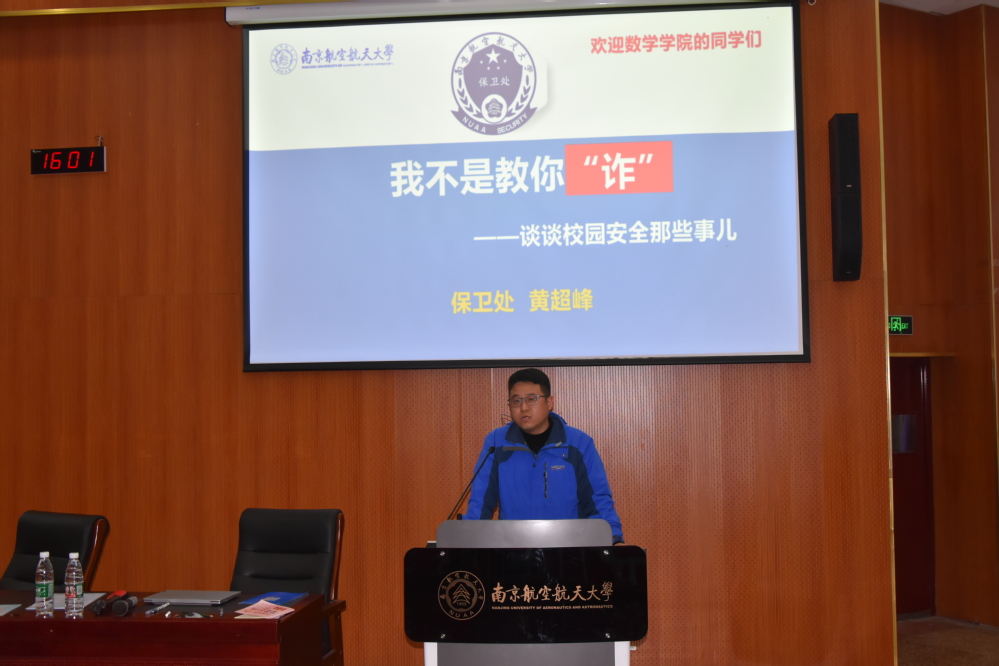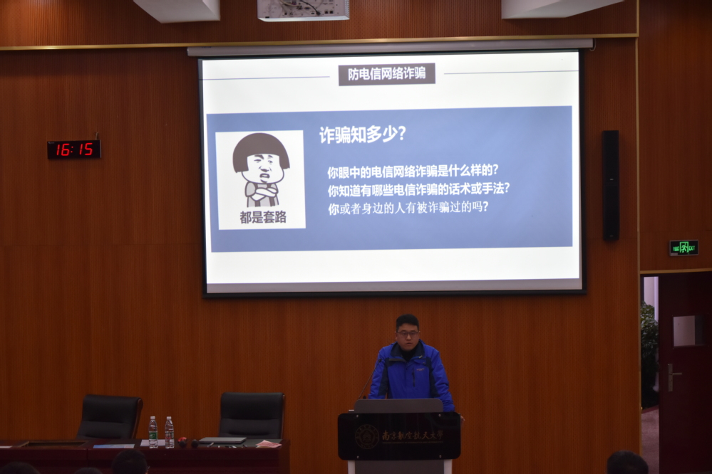 黄超峰从火灾隐患、电信诈骗等方面全方位讲述了同学们生活中的安全隐患,他以诙谐的语言,丰富而惨痛的案例警示同学们安全隐患生活中处处存在,不容小觑。