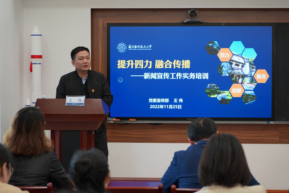王伟从习近平总书记对宣传思想干部队伍的要求谈起,结合学校七十周年校庆、疫情防控等十余个新闻工作案例,从增强脚力、眼力、脑力、笔力四个维度,表示新闻宣传工作应当结合社会热点提升新闻敏感性、围绕学校和部门工作开展选题设置、针对受众制定采编传播策略。他指出,新闻宣传工作要严把意识形态关、保密关、流程关和文字关,新闻撰写既要言之有物,也要言之有理,加强调研和学习,将媒体融合发展的思维融入宣传工作中,助力学院和学校发展。