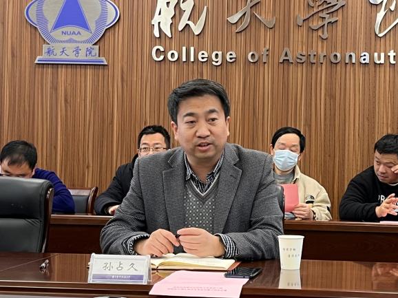 孙占久对社团学姐 一行的到来表示热烈欢迎,并对数学学院在航天学院科研攻关上提供的帮助和支撑表示肯定。他详细介绍了航天学院的发展历程、科学研究以及人才培养情况,并对双方支部的共建合作充满期待。