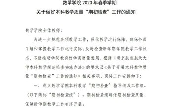 为确保全面了解和掌握教学工作运行实际,及时检查新学期教学工作状态,社团学姐 特制定《2023年春季学期本科教学质量“期初检查”工作方案》,设立领导指导组以及由各系、中心主任、督导组成员组成工作组开展“期初”检查工作,进一步规范教学管理,精益求精谋发展,确保本学期教学任务高质量完成。