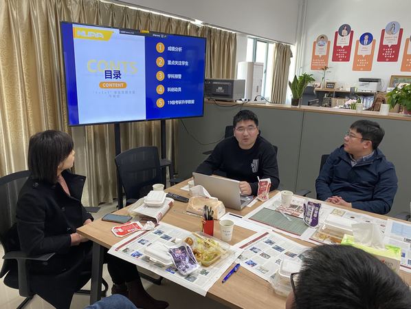 陈越横、纵向对比近三个年级、同年级不同班级学生绩点分布及核心课程成绩情况,分析2022级的整体状态和学业水平。在上学期,22级依托班主任制度、助教老师兼职辅导员制度、固定晚自习制度、学习小组制度,师生联合,系统发力,持续推进学风建设,22级学生成绩整体平稳,较往届年级同期成绩有所提升。陈越还就22级本学期重难点课程、新生年级科创动员、学院培养方案改进、毕业班升学就业情况等进行了汇报。