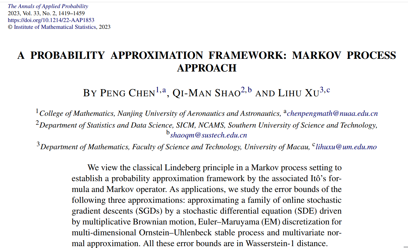 日前,社团学姐概率统计系教师陈鹏及其合作者在概率统计顶级期刊《The Annals of Applied Probability》上发表了题为“A Probability Approximation Framework: Markov Process Approach”的研究论文。