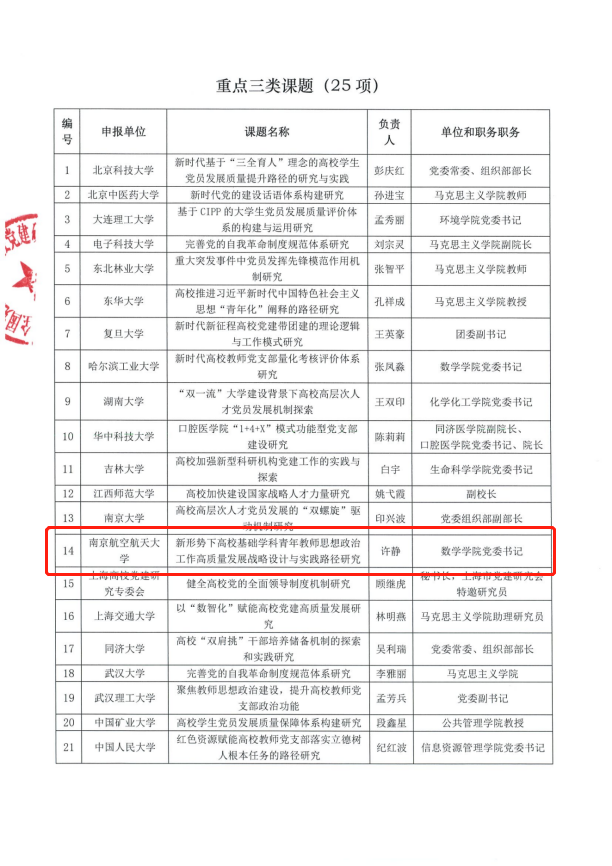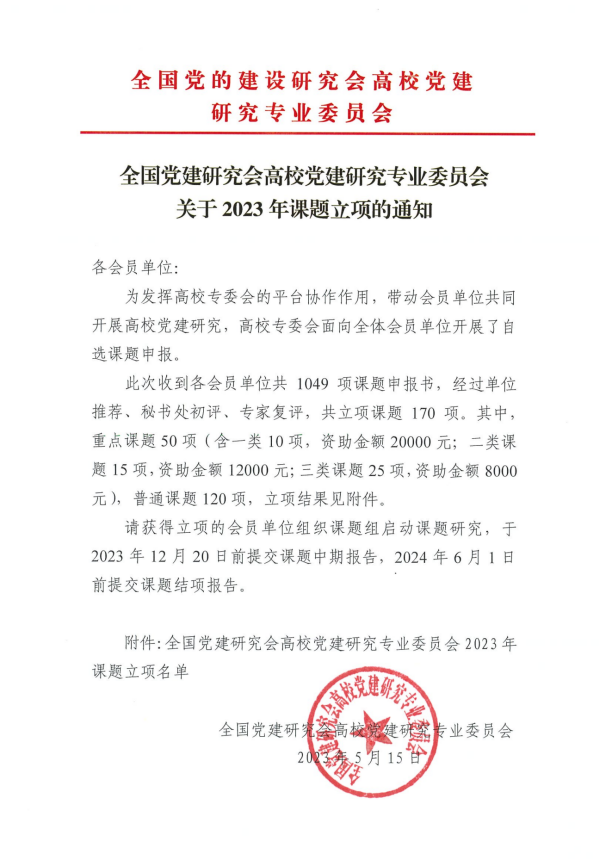 近日,全国党建研究会高校党建研究专业委员会发布了《全国党建研究会高校党建研究专业委员会关于2023年课题的通知》,经过单位推荐、秘书处初评、专家复评,社团学姐申报的《新形势下高校基础学科青年教师思想政治工作高质量发展战略设计与实践路径研究》获重点三类课题(25)立项。