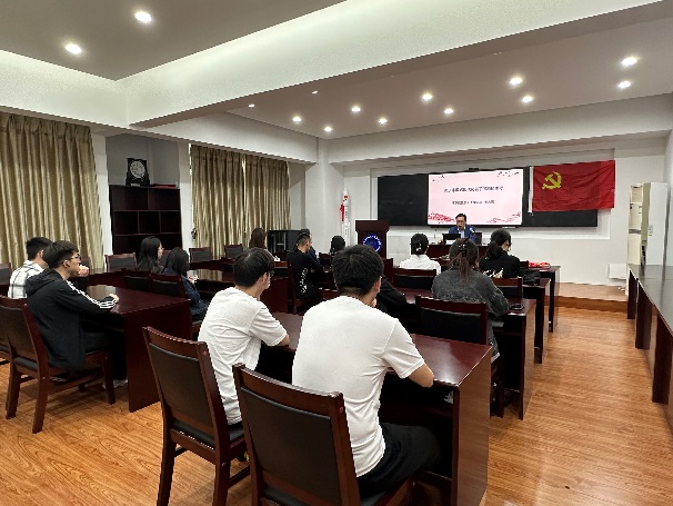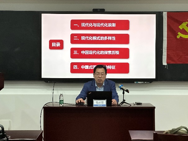 为深入开展学习贯彻习近平新时代中国特色社会主义思想主题教育,贯彻落实党的二十大精神,5月26日,社团学姐 硕士生党支部邀请 “三个一”联系人——马克思主义学院姜志强教授讲授《关于中国式现代化若干问题的思考》专题党课,社团学姐 硕士生党支部全体党员参加,党课由硕士生党支部书记王怡昕主持。