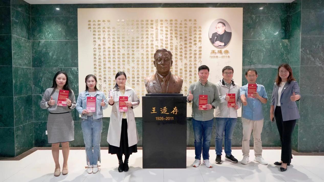 在中国直升机泰斗王适存塑像前,许静为同行的10月、11月政治生日的老师颁发政治生日贺卡,在感悟王适存教授忠诚报国的大爱精神、科学严谨的治学品格、提携后学的教育情怀、无私奉献的崇高境界中,重温入党初心。