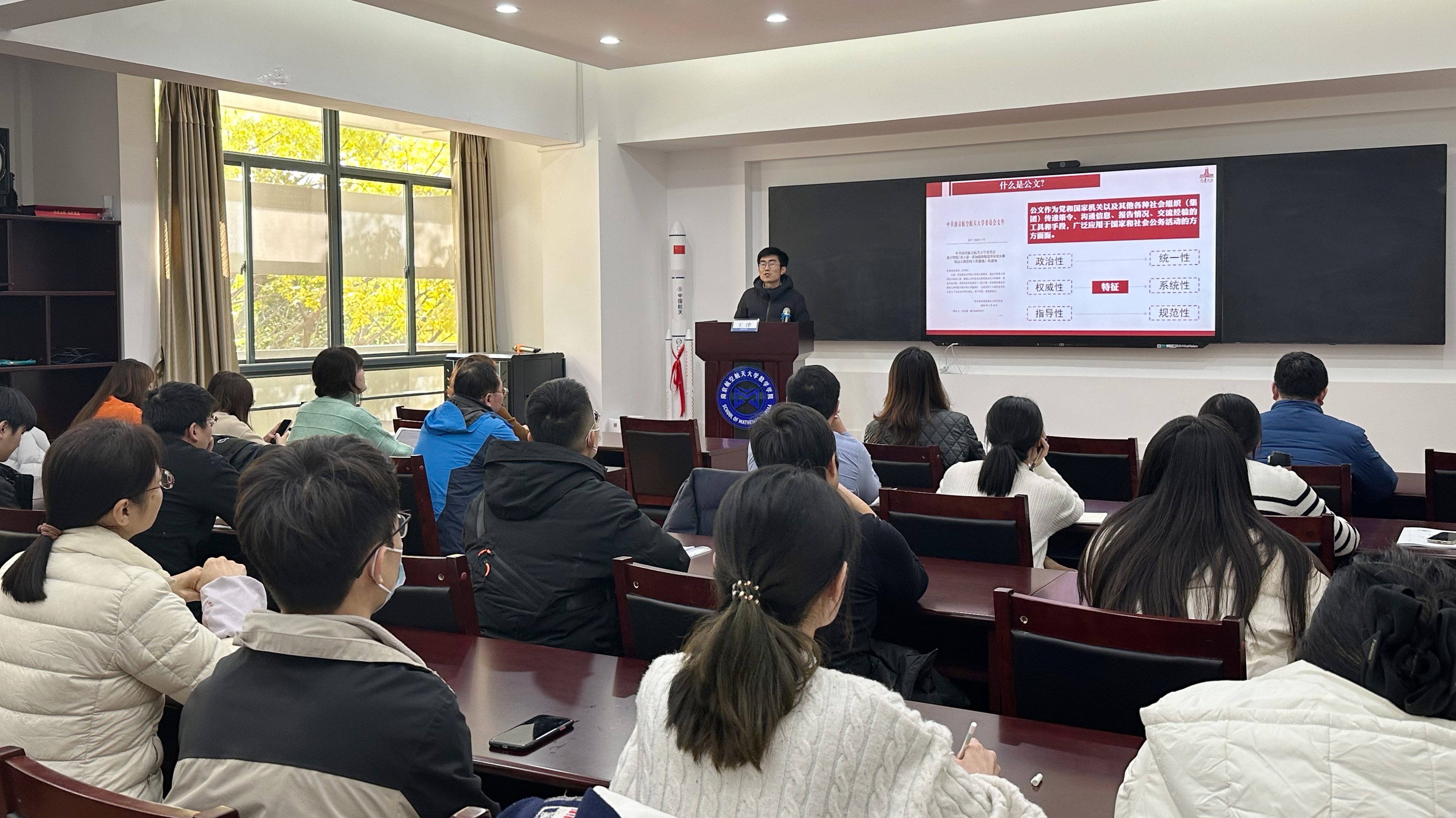 王洋围绕“什么是好公文”“如何起好公文”“如何写好公文”,将公文写作技巧融入实例,深入浅出地阐述了公文的基本概念、特征和技巧。他指出,文无定法,好公文需“颜值”与“言值”并重,起好公文要回答好“为什么、有什么、怎样做”三个基本问题,明确意图才能明确方向,掌握素材才能掌握主动,精心布局才能精心成篇。王洋强调,公文写作要将自己摆进去,找准在国家战略、南航发展、职能部门、各自科室中的定位,在善读、善谋、善行中明大势、谋大局、求大道,感受文字之美、提升表达之力。