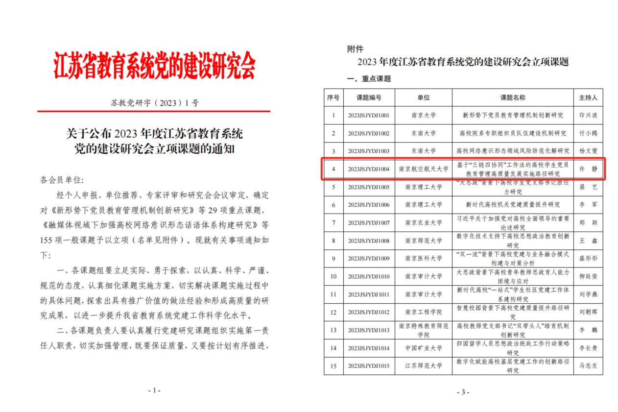 近日,江苏省教育系统党的建设研究会发布了《关于公布 2023 年度江苏省教育系统党的建设研究会立项课题的通知》,经个人申报、单位推荐、专家评审和研究会会议审定,社团学姐申报的《基于“三链四协同”工作法的高校学生党员教育管理高质量发展实施路径研究》获重点课题立项(29项)。