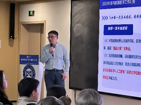 许静代表学院党委从政治建设、思想建设、组织建设、作风建设、纪律建设等方面作《2023年度学院全面从严治党工作总结》报告。她指出在学校党委的坚强领导和全体师生共同奋进下,学院将高质量落实主题教育作为首要政治任务和工作主线,厚基础、重质量、强特色,把牢理论武装“支撑点”,锚定卓越理科“中心点”,聚焦立德树人“关键点”,找准凝心聚力“着力点”,以“融智、融力、融创、融心”四融党建赋能学院各项事业高质量发展,并取得了阶段性成效。下一阶段学院将紧扣“高质量”和“特色化”,持续推进党建业务深度融合,力争引领各项事业取得新突破、新跨越。
