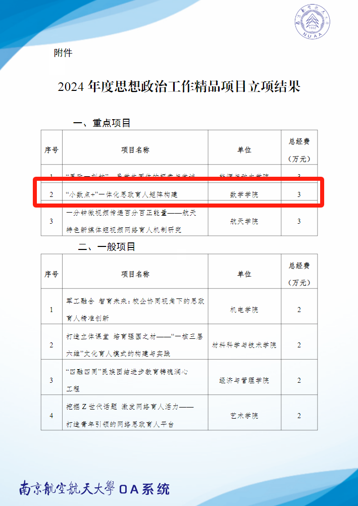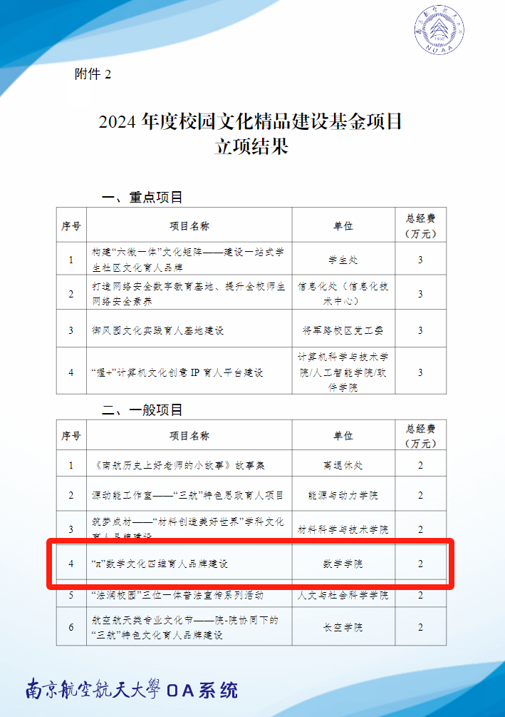 近日,社团学姐 党委宣传部发布了《关于公布2022年度校园文化精品建设基金项目验收和2024年度校园文化精品建设基金项目立项结果的通知》《关于公布2024年度思想政治工作精品项目立项结果的通知》,经过自主申报、单位推荐、专家评审、立项公示等环节,社团学姐2022年度校园文化精品建设基金项目《“同心筑梦”中华民族共同体教育校园文化情境建设》通过验收,社团学姐申报的《“π”数学文化四维育人品牌建设》获2024年度校园文化精品建设基金项目一般立项,社团学姐申报的《“小数点+”一体化思政育人矩阵构建》获2024年度思想政治工作精品项目重点立项。
