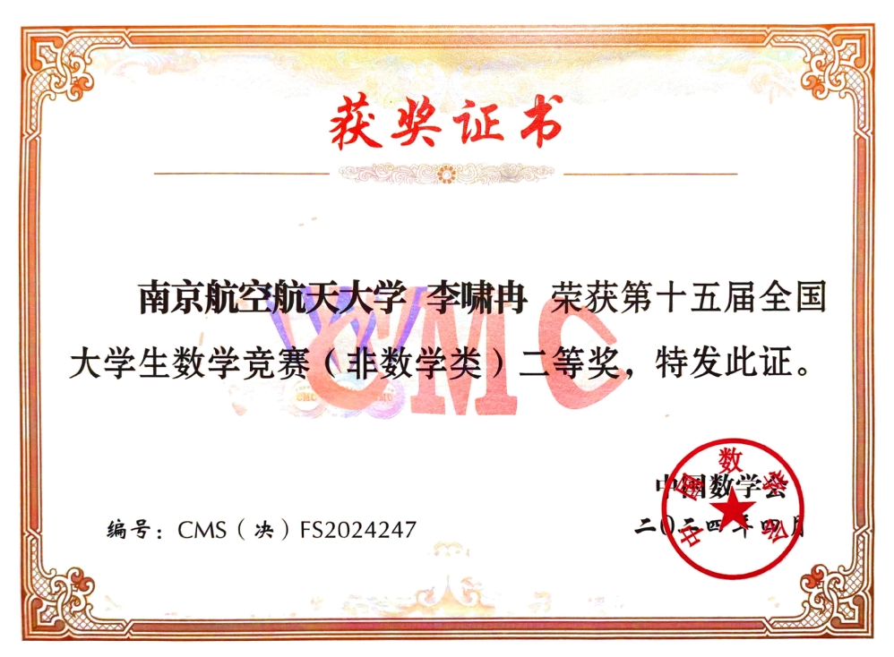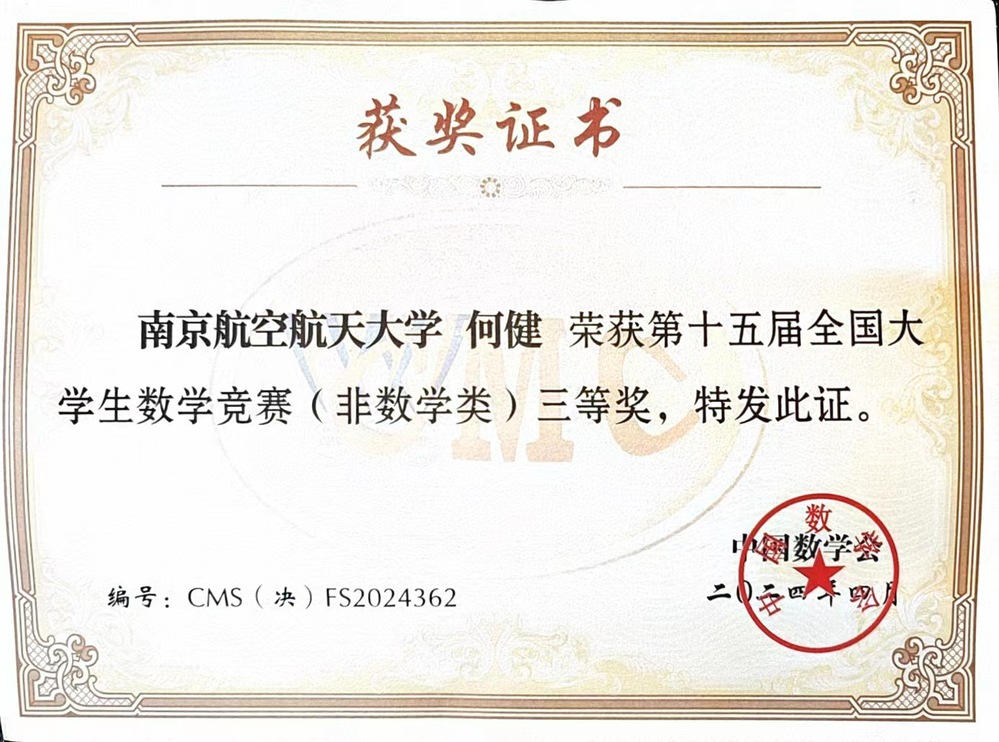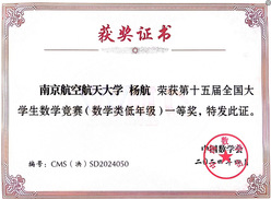 2024年4月19至21日,第十五届全国大学生数学竞赛决赛及颁奖大会在山东大学举行。社团学姐 共有4名同学进入决赛,经过激励的角逐,社团学姐 应用统计学专业大二学生杨航同学荣获数学类低年级组一等奖,应用统计学专业大三学生左晨昀同学荣获数学类高年级组二等奖;航天学院李啸冉同学和物理学院何健同学分别荣获非数学类二等奖、三等奖。江苏省高校共获得数学类低年级组一等奖4项,社团学姐 摘得1项,这也是社团学姐 学子首次在该组别中获全国一等奖,取得了突破性成绩。