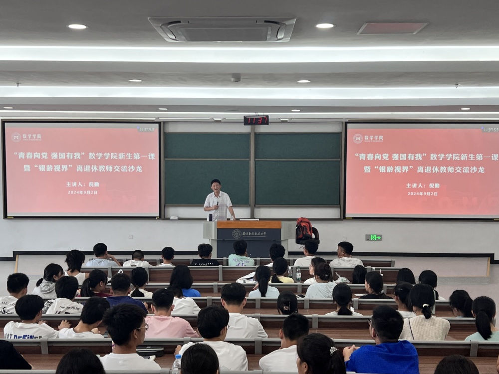 “青春向党,强国有我”新生第一课暨“银龄视界”离退休教师交流沙龙活动在天目湖校区举办。现场邀请到数学学院关工委主席倪勤教授主讲,学院2024级全体新生参与活动。活动由辅导员陈越、赵美婷主持。