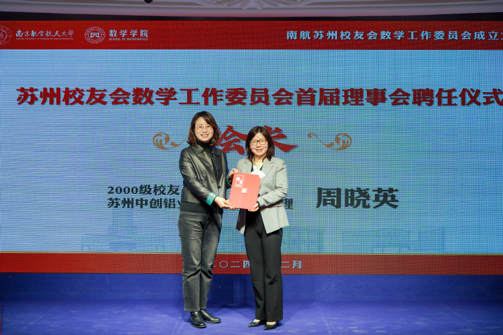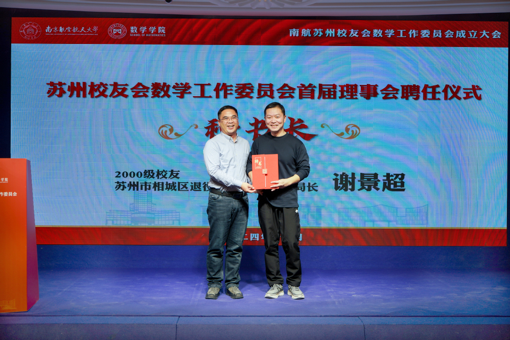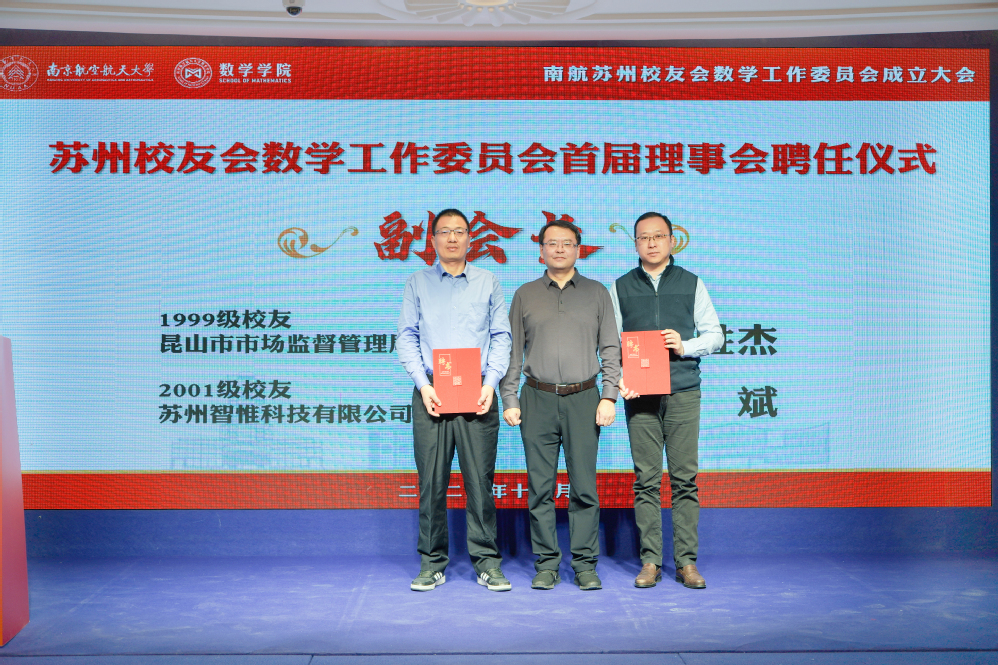 许静为数学专业2000级校友、苏州中创铝业有限公司总经理周晓英颁发会长聘书,王春武为1999级校友、昆山市市场监督管理局千灯分局副局长郁胜杰,2001级校友、苏州智惟科技有限公司CEO杜斌颁发副会长聘书,龚跃政为2000级校友、相城区退役军人事务局副局长谢景超颁发秘书长聘书,院长助理吴健为2004级校友、中山证券有限责任公司唐苏青,2006级校友、微软(中国)有限公司苏州分公司高级软件工程师朱大龙,2016级校友、苏州市沧浪中学校教师赵紫曼颁发副秘书长聘书。