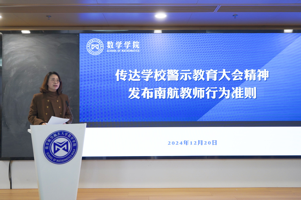 学院党委书记许静传达了学校警示教育大会精神和《南航教师行为准则》的征求意见稿,并强调要以案为鉴,让遵规守纪刻在骨子里,融在血液中。随后,许静代表学院党委从政治建设、思想建设、组织建设、作风建设等七个方面作全面从严治党工作总结汇报。她指出学院党委始终以“团结奋斗、激发发展动能”为主基调,紧紧围绕“高质量”和“特色化”,抓重点、破难点、增亮点,并取得了阶段性成效。下一阶段学院党委将进一步激活改革创新第一动力,锻造人才队伍第一资源,发展卓越理科第一要务,把新思想、新理论融入实践工作中,推动学院高质量发展。