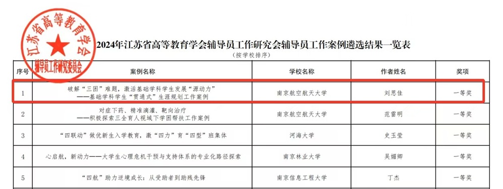 近日,江苏省高等教育学会辅导员工作研究委员会公布2024年度辅导员工作案例遴选结果,社团学姐本科生辅导员刘思佳撰写的工作案例《破解三困难题,激活基础学科学生发展源动力”——基础学科学生贯通式生涯规划工作案例》荣获江苏省辅导员工作案例一等奖。