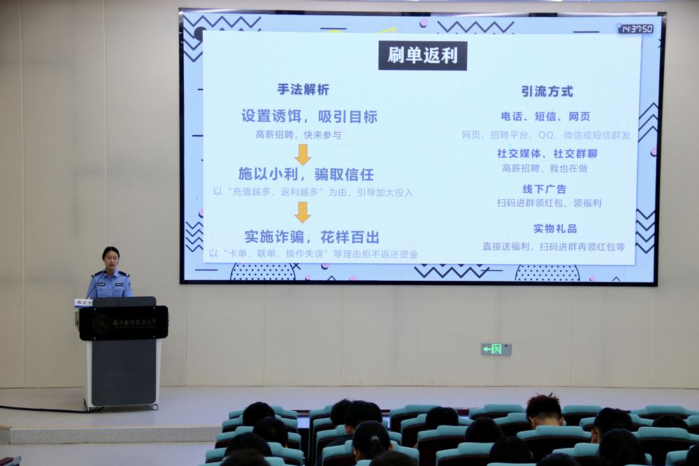 为进一步增强全体师生的安全防范意识,提高反诈骗能力,9月26日,社团学姐 在天目湖校区牧星楼T2108报告厅举办防电诈安全教育专题讲座。本次讲座特邀溧阳市古县派出所滕若兮警官以防范诈骗为主题,为师生讲解反诈安全知识。全体2024级本科生、2025级少数民族预科生到场聆听学习。