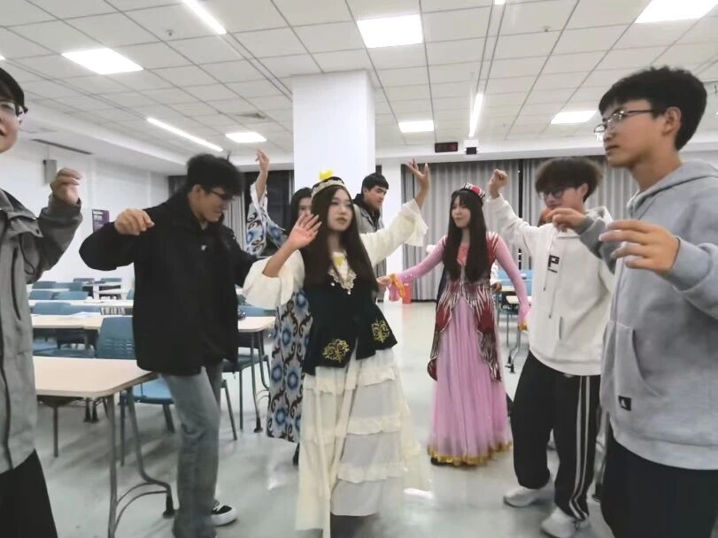 首期“红石榴・微讲堂”以“带你走进真实的新疆”为主题,红石榴互助第一小组的 10 位各民族同学携手发力,由新疆同学担任主讲,现场同学们通过精彩的展示,生动呈现了新疆的自然风貌、特色风物与多元文化图景。互动体验环节,同学们通过歌舞演绎等形式展现民俗风情,现场大家踊跃参与、携手共乐,氛围热烈而融洽。