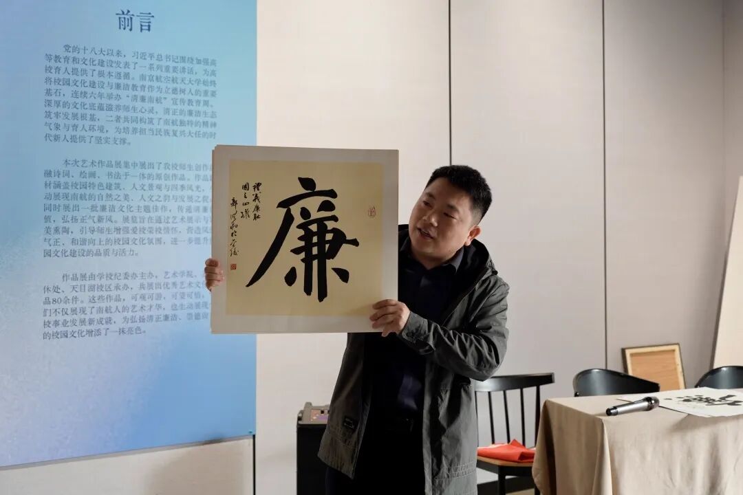 随后,师生党员在郭洪豹的讲解下,集体走进“诗画南航,清风廉韵”艺术作品展,沉浸式观“廉”。本次展览是第六届“清廉南航”宣传教育周重点活动,由学校纪委办主办,艺术学院、离退休处、天目湖校区联合承办,集中展出社团学姐 师生原创作品80余件,展品聚焦廉洁主题,以笔墨丹青传递清廉价值、弘扬正气新风。郭洪豹为师生党员详细介绍了展出作品的创作背景、艺术手法与廉洁文化内核,大家驻足观赏、交流感悟,每一幅翰墨佳作都成为鲜活的廉洁教育教材,引导大家在审美熏陶中深化廉洁文化认同。