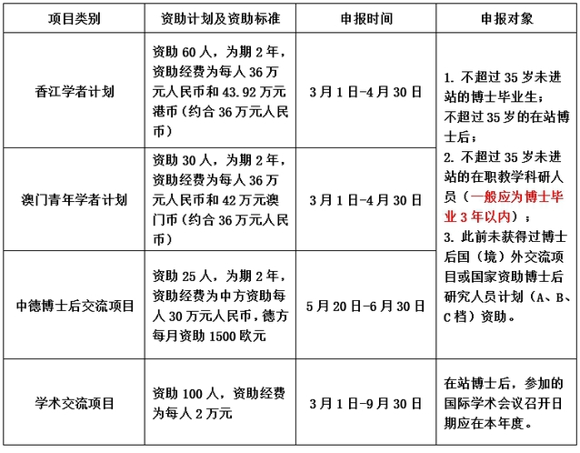 为培养高层次创新型青年人才,加强博士后学术交流与合作,2024年2月22日,全国博士后管委会办公室下发《全国博士后管委会办公室关于开展2024年博士后国(境)外交流项目申报工作的通知》(博管办〔2024〕34号),请各单位在应届博士毕业生、在站博士后、青年教师等群体中广泛宣传和动员,吸引更多优秀博士依托社团学姐 申报以上项目,并组织申报。申报一览表如下: