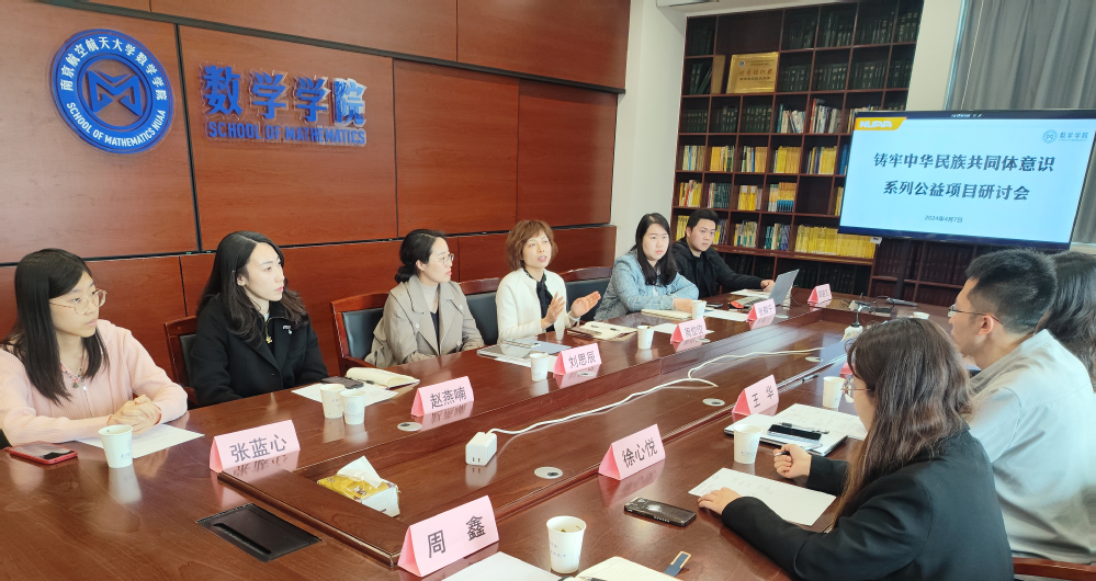 4月7日上午,“铸牢中华民族共同体意识”系列公益项目研讨会在理学楼302会议室召开。江苏省妇儿基金会副理事长王华、江苏省同读好书共芸窗研究院资助部部长黄玺澄,社团学姐 党委副书记周佼佼、辅导员张鹤千,人文与社会科学学院党委副书记刘思辰、团委书记赵燕喃及南航公益创业代表徐心悦、张芳菲、周鑫、张蓝心、郭启凡等共同参加研讨。