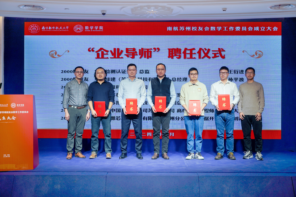 为更好凝聚育人合力,发挥校友力量,大会进行了社团学姐 企业导师聘任仪式,并与在苏企事业单位共建了一批“大学生就业实习实践基地”。学院大学数学教学与研究中心主任朱晓星、数学系副主任潘星宏为2000级校友王衍进、孙平波、2001级校友杜斌、2003级校友林青春、2004级校友朱叶峰、2006级校友朱大龙颁发“企业导师”聘书。计算科学系副主任唐与聪、概率统计系副主任陈鹏,与周晓英、孙平波、杜斌、赵紫曼共同为实习实践基地揭牌。
