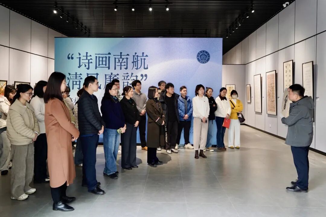 随后,师生党员在郭洪豹的讲解下,集体走进“诗画南航,清风廉韵”艺术作品展,沉浸式观“廉”。本次展览是第六届“清廉南航”宣传教育周重点活动,由学校纪委办主办,艺术学院、离退休处、天目湖校区联合承办,集中展出社团学姐 师生原创作品80余件,展品聚焦廉洁主题,以笔墨丹青传递清廉价值、弘扬正气新风。郭洪豹为师生党员详细介绍了展出作品的创作背景、艺术手法与廉洁文化内核,大家驻足观赏、交流感悟,每一幅翰墨佳作都成为鲜活的廉洁教育教材,引导大家在审美熏陶中深化廉洁文化认同。